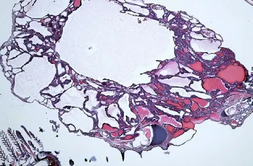Une coupe histologique de la zone branchiale avec coloration spécifique. On reconnaît des lamelles branchiales en bas à gauche de la photo, donnant une idée de la taille de la masse qui correspond à toute la structure au centre de l’image.