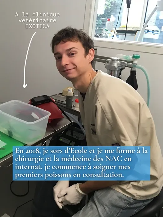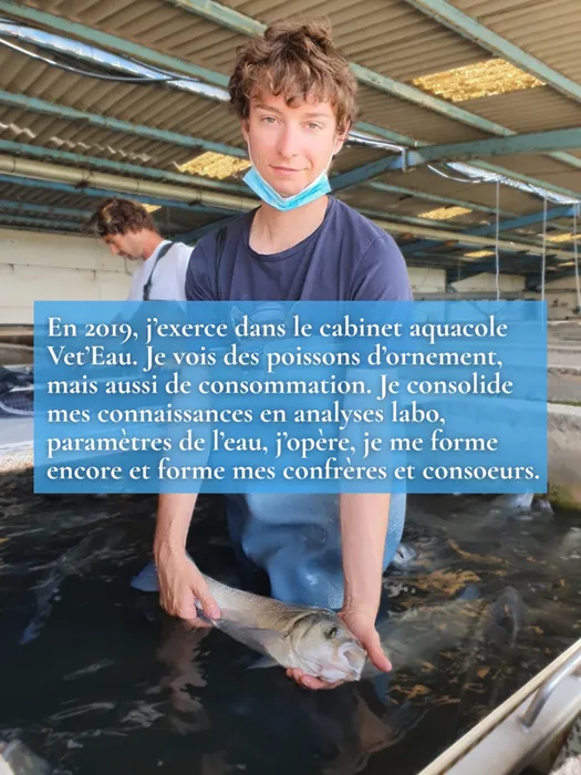 Au terme de cette année de formation spécifique il intègre en 2019 le cabinet vétérinaire aquacole Vet’Eau au sein duquel il développe ses connaissance en médecine collective des espèces aquatiques avec le suivi sanitaire d’élevages de poissons de chair (bars, daurades, maigres, salmonidés …) ou d’ornement (cyprinidés, poissons exotiques…) et la médecine de population. Il se focalise parallèlement sur la médecine individuelle du poisson d’ornement et d’aquarium, en créant le service Vet’eau-Ornement. Il réalise au cours de presque quatre années d’exercice, des consultations, des interventions à domicile, des conférences et formations, des examens complémentaires (échographie, radiographie, parasitologie, ophtalmologie …) et des chirurgies sur divers poissons d’ornement (koïs, poissons rouges, arowana, cichlidés …).