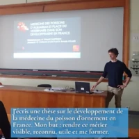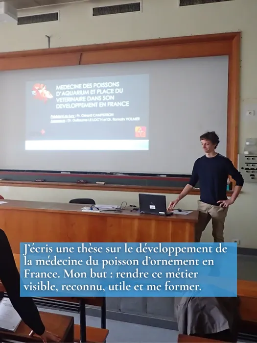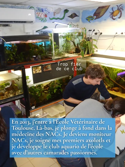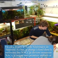 Il s’implique corps et âme dans le club aquariophile de l’École Nationale Vétérinaire de Toulouse (CAENVT) qu’il développe et dynamise. Il s’intéresse au sein de son cursus également aux Nouveaux Animaux de Compagnie (NAC) et devient moniteur de TP à la clinique des NAC en troisième année. Il effectue une dernière année d’école à la clinique «NAC et faune sauvage» et rédige en parallèle sa thèse d’exercice vétérinaire sur le développement de la Médecine des poissons d’ornement en France.