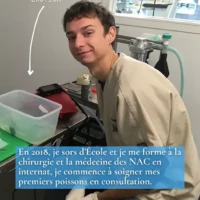 Attiré par la médecine des espèces sauvages et singulières, incluant les poissons, le Dr Blanc réalise en 2018 une année d’internat à la clinique Exotica à Pessac (33) où il se forme en médecine interne, chirurgie et urgentologie des NAC (qui rassemblent oiseaux, reptiles et petits mammifères), des animaux de zoos, auprès des Dr. Héloïse COUSIN et Morgane PRIETO. Il y assure les consultations pour poissons et axolotls.